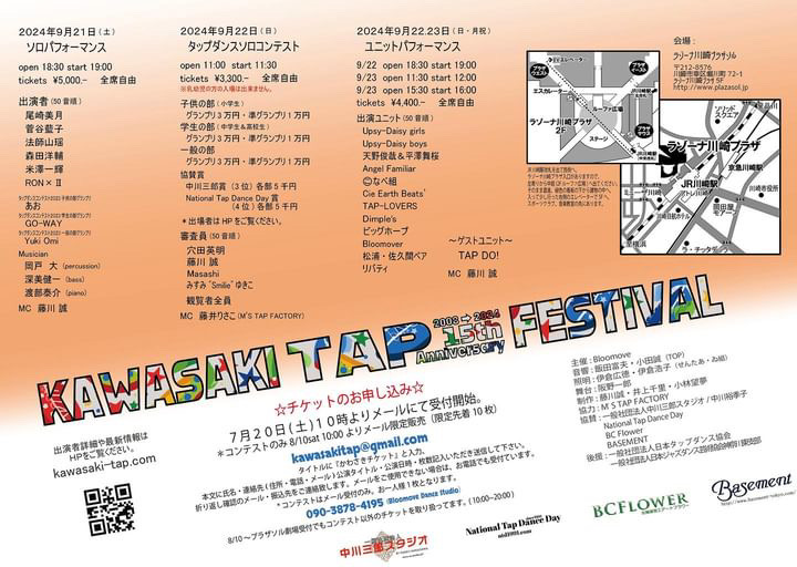 川崎タップフェスティバルは9/21-23の3日間で行われるソロやユニットのパフォーマンス、コンテストなど盛りだくさんなタップダンス祭りです!ぜひみにいらしてくださいませ。お待ちしております。